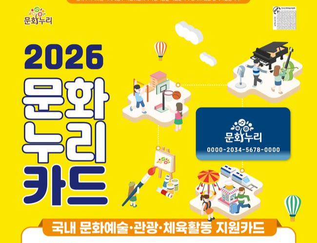 문화체육관광부는 취약계층의 문화 향유 기회를 넓히기 위해 2026년 ‘문화누리카드’ 연간 지원금을 15만 원으로 인상하고, 청소년과 60∼64세 생애전환기 대상자에게는 1만 원을 추가해 2월 2일부터 발급·사용을 시작한다고 밝혔다.