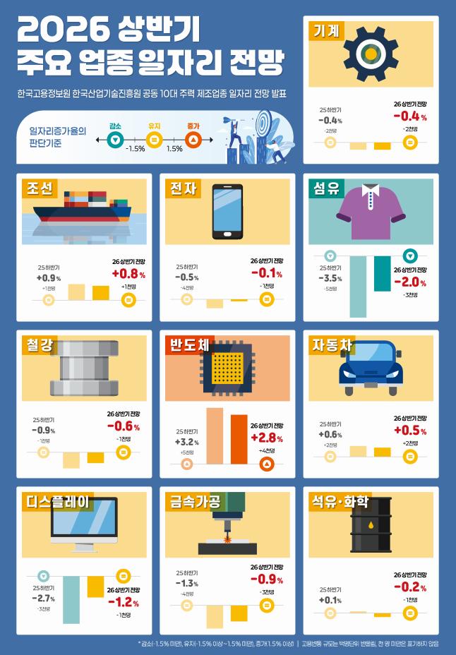 한국고용정보원과 한국산업기술진흥원이 2026년 상반기 주요 업종 일자리 전망을 발표했다. 이번 전망은 기계·조선·전자·섬유·철강·반도체·자동차·디스플레이·금속가공·석유·화학 등 10개 제조업을 대상으로 고용보험 피보험자 자료와 직종별 사업체 노동력조사를 바탕으로 분석했다. 지난해 상반기와 비교해 반도체 업종만 고용 증가가 예상됐고, 섬유 업종은 감소, 나머지 8개 업종은 ‘유지’로 분류됐다.