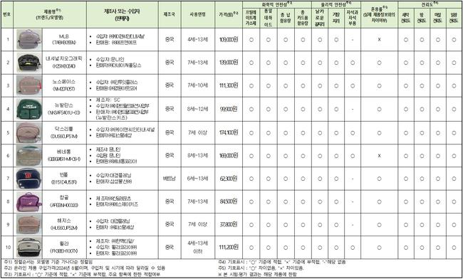 시중에 판매 중인 저학년 어린이 책가방 10개 제품이 화학적·물리적 안전성 시험에서 모두 적합 판정을 받았다.