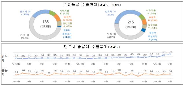 품목별로는 반도체 수출이 전년 동기 대비 175.9% 증가한 75억8천만 달러로 가장 큰 폭의 증가세를 보였다. 반도체는 전체 수출에서 35.3% 비중을 차지하며 지난해보다 15.4%포인트 확대됐다.