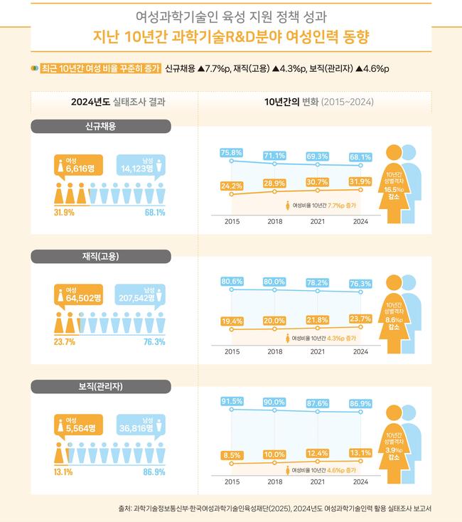 과학기술정보통신부와 한국여성과학기술인육성재단(WISET)이 발표한 ‘2024년도 여성과학기술인력 활용 실태조사’에 따르면, 여성 연구개발 인력의 참여가 채용과 재직 전반에서 꾸준히 확대되고 있는 것으로 나타났다. 이번 조사는 전국 5,138개 과학기술 분야 연구기관을 대상으로 실시됐다.