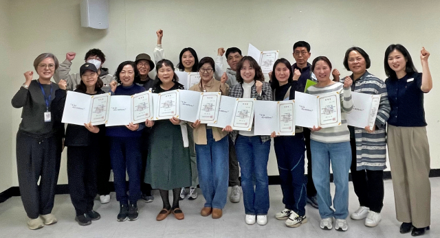 호매실장애인종합복지관 ‘시민옹호인 양성 교육 및 위촉식’에서 참여자들이 위촉증을 들고 기념촬영을 하고 있다