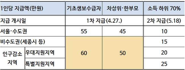 지원 대상은 전체 국민의 약 70%로, 소득 수준과 거주 지역에 따라 1인당 10만원에서 최대 60만원까지 차등 지급된다. 정부는 취약계층에 대한 선제적 지원을 통해 생활 안정과 경기 회복을 동시에 도모한다는 방침이다.